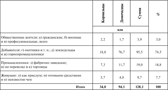 Теперь мы перейдем к трем последним столбцам табл. 3, содержащим то поучительное деление на кормильцев и домочадцев, которое мне кажется понятным для каждого русского человека. Кормильцы и домочадцы в России распределены так: