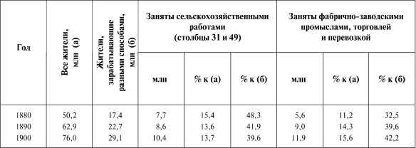 Распределение жителей по родам и видам занятий в цензусах С.-А. С. Штатов дается очень подробное, и весьма оно поучительно по той причине, что показывает изменения, происходящие с течением времени. Коротенькое извлечение, приводимое вслед за сим, надеюсь, это ясно показывает, хотя относится только до 20-летнего срока: 1880–1900 гг. Оно типично и ясно (см. табл. на с. 102, вверху).