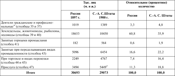 Для 1900 г. приведем и некоторые подробности по отношению к общему числу «кормильцев». В С.-А. С. Штатах всего кормильцев насчитано для 1900 г. 29 млн (38 %) на 76 млн всех жителей, а у нас в 1897 г. было – без военных – 33 млн (менее 27 %) на 127 млн всех жителей, опять без военных, которые в американских цензусах в общий счет не введены, что принуждает для сравнимости чисел то же сделать и по отношению к России. В прилагаемой таблице исключены также лица, перечисленные выше в столбцах 48 и 49, потому что они не содержатся в американском списке «Population engaged in gainful occupations». Пусть же у нас кормильцев, тружеников мало, но очень поучительно узнать, как они распределены у нас и в С.-А. С. Штатах. Для сравнения приводим таблицу, где даются и абсолютные и относительные числа.