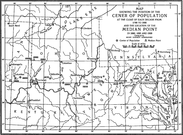 Сущность того приема, который применен далее для определения центра России, заключается в предшествующих соображениях, но раньше, чем говорить о практических подробностях приемов нахождения центра России, необходимо, во-первых, объяснить те разнообразные смыслы, в которых можно признавать понятие о центре страны, и, во-вторых, указать те соображения, которые заставляют искать положение центра страны, понимаемого в том или ином смысле. Прежде чем обратиться к этим двум предметам, заметим предварительно, что отыскание центра России до сих пор, сколько мне известно, никогда не делалось в сколько-либо точном виде, хотя для других стран центр их находился и сознательное отношение к общим интересам своей страны имеет [место] совершенно явное. Примером могут служить С.-А. С. Штаты, в которых центр населенности страны определяется при каждой переписи, производимой с 1790 г. правильно через каждые 10 лет. Мы прилагаем здесь цинкографическую копию карты С.-А. С. Штатов, показывающей звездочками положение центра населенности, полученное при каждой переписи. Из карты видно, что с 1790 по 1900 г. центр населенности Штатов двигался почти по параллели 39° сев. широты от –76° (знак «минус» значит к западу) долготы (считая от Гринвича) до –86° долготы, т. е. каждые 10 лет почти на 1° по параллели от восточных берегов Атлантического океана, где лежат Балтимор и Вашингтон, внутрь страны на запад к г. Колумбусу, лежащему на пути между Чикаго и Сан-Люисом, в штате Индиана. А так как на этой параллели разность в 1° долготы отвечает 81,2 версты, то перемещение с 1790 г. (–76°1,2′ долготы и 39° 16,5′ широты до 85°48,9′ долготы и 39°9,6′ широты) по 1900 г. равняется 786 верстам. Уже из этого передвижения центра населенности ясно, что сведения о положении центра страны имеют свое историческое значение, очевидное уже в том, что узлы жизни С.-А. С. Штатов сходились в былое время к берегам Атлантического океана, а ныне, видимо, наиболее усилены около Чикаго и Сан-Люиса. Не считая надобным долее останавливаться на этом, перехожу прямо к объяснению тех разнообразных смыслов, в которых можно говорить о центре страны.
