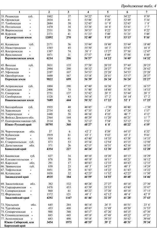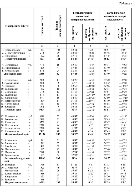 Эти выражения53 применены при расчетах как центра поверхности, так и центра населения всей России и 19 ее подразделений (краев, земель), считая элементами губернии. Положение центра (его геогр. широты и долготы di) и веса (pi), принятых во внимание (а именно при нахождении центра поверхности весом точки, определенной географической долготою и широтою, считалась величина поверхности губерний, а при нахождении центра населения – число всех жителей губернии), дано в табл. 1 и повторено в табл. 4.