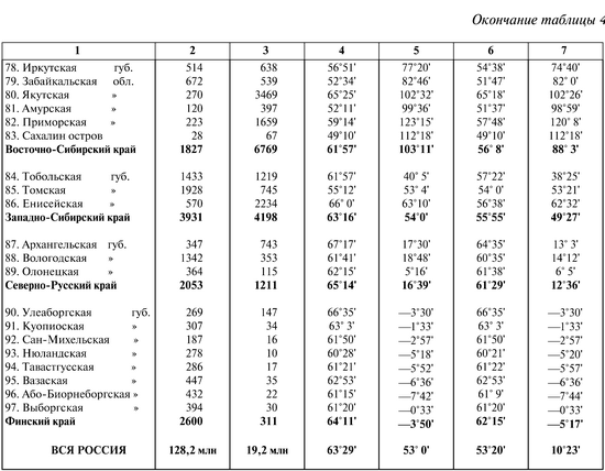 Положение центра поверхности всей России, найденное из приведенных в табл. 4 данных для 97 губерний, определяется следующими географическими координатами: