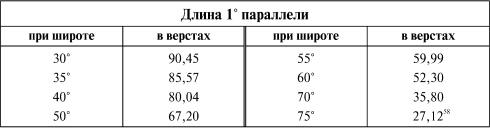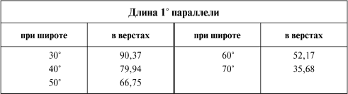 Приняв Северный полюс за центр, опишем через вышеназначенные точки, отвечающие определенным широтам, концентрические круги, которые и будут выражать на карте параллели или круги широт. Таким образом, все широты нанесутся с полной определенностью на основании поставленных условий. Чтобы найти положение меридианов, отвечающих долготам, пойдем по окружности средней условной параллели (в 55° сев. широты) и будем на этой параллели откладывать в том же масштабе, каков применен на меридиане, те расстояния, которые в действительности на этой широте разделяют меридианы. Приводим в прилагаемой таблице длину 1° в верстах для разных широт, рассчитывая величины эти по вышеданным элементам, т. е. по величине экваториального и полярного радиусов земного сфероида.