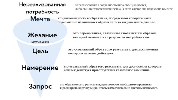 – это переживания, связанные с возникшим образом, который появляется сразу же за потребностью. Чем же желание отличается от мечты? Мечта это целый набор образов за длительный промежуток времени. А желание возникает как некое переживание в ответ на образ, далее приходит мотивация совершить какое-либо движение. Сначала у человека возникает чувство, эмоция, ощущение. Потом у него возникает потребность, а потом желание. На нашем примере с девочками описать этот процесс можно так. У девочки возникло чувство голода, затем потребность в свежем и вкусном, потом появилось желание съесть яблоко – вот это и есть образ, который она запечатлела. Далее у девочки появилась мотивация попросить яблоко. Если девочка получила яблоко, то история с яблоком закончилась, если же нет, то история с яблоком переходит в подсознательный образ, и если желание долго не реализуется, этот образ склеивается с другими и присоединяется к мечте. Соответственно, желание всегда связано с мотивацией. Желание