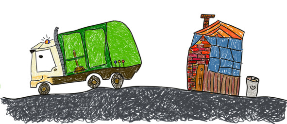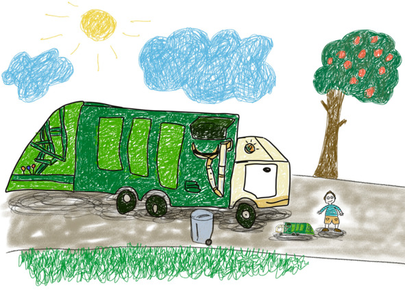 – Привет! – как можно ласковее говорит мусоровоз. Голос у грузовика громкий, ему не хочется пугать малыша. – Как тебя зовут? – гудит он.