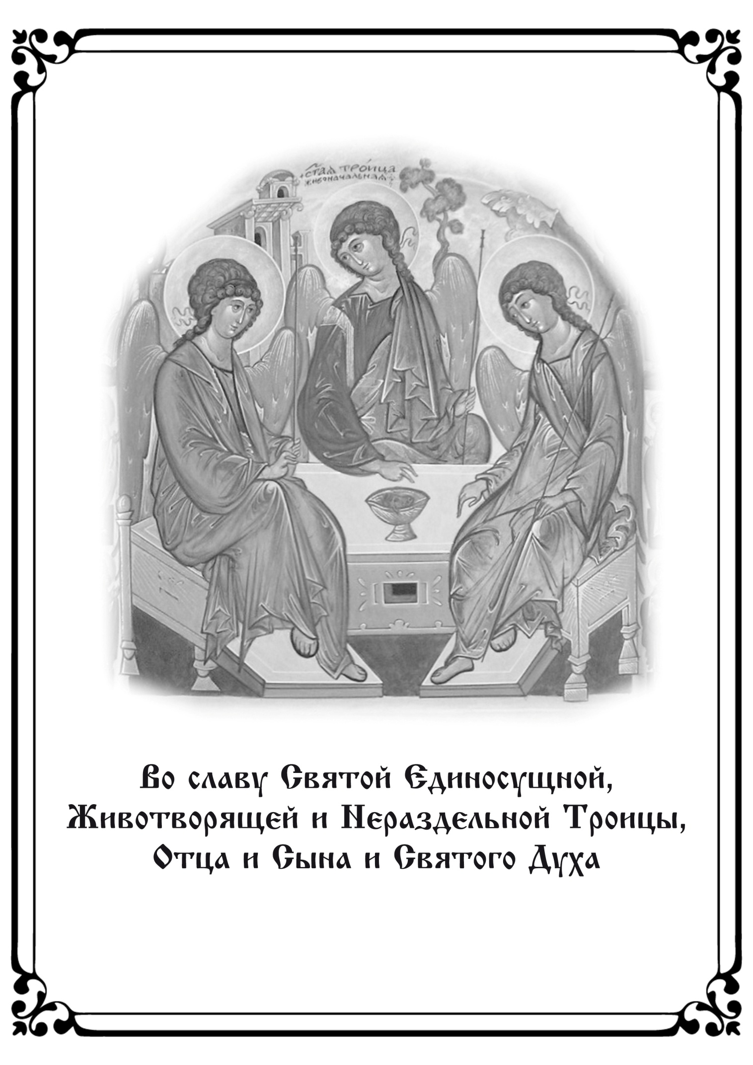 Царю́ Небе́сный, Уте́шителю, Ду́ше и́стины, И́же везде́ сый и вся исполня́яй, Сокро́вище благи́х и жи́зни Пода́телю, прииди́ и всели́ся в ны, и очи́сти ны от вся́кия скве́рны, и спаси́, Бла́же, ду́ши на́ша 2