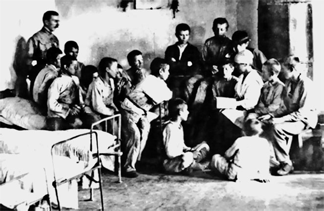 20. Чтение книги в спальне колонистов. Слева стоит А. С. Макаренко. 1921 г.