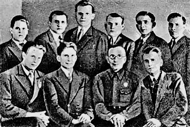 75. Сидят: первый справа В. Н. Терский, второй – А. С. Макаренко. Студенты юридического факультета, бывшие коммунары. 1939 г.