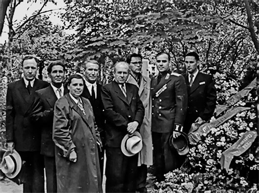 81. Открытие памятника А. С. Макаренко на Новодевичьем кладбище. Москва. 1952 г. Слева направо: Е. З. Балабанович,Т. Д. и В. Н. Татариновы, Н. Э. Фере, И. А. Соколянский Ю. Б. Лукин, Л. М. Салько, А. Г. Явлинский.