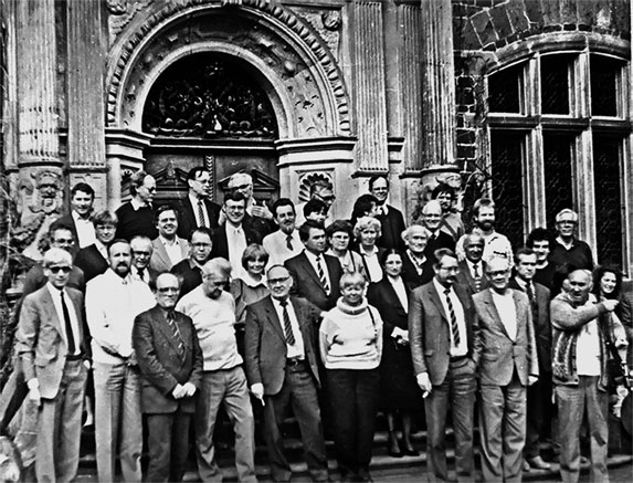 82. Участники 6-го Международного симпозиума «Современное состояние и перспективы развития макаренковедения» перед замком «Рауишхольцхаузен» в окрестностях Марбурга. Слева направо: первый ряд – Ф. А. Фрадкин, третий – В. Кумарин, последний – Арпат Петрикиш; второй ряд – Уве Ценкер, третий – Герц Хиллиг, пятый – А. Г. Холодюк; третий ряд: третий – В. П. Борисенко, пятый – Либор Пеха, шестая – С. С. Невская; пятый ряд: четвертый – Александр Левин. Май 1989 г.