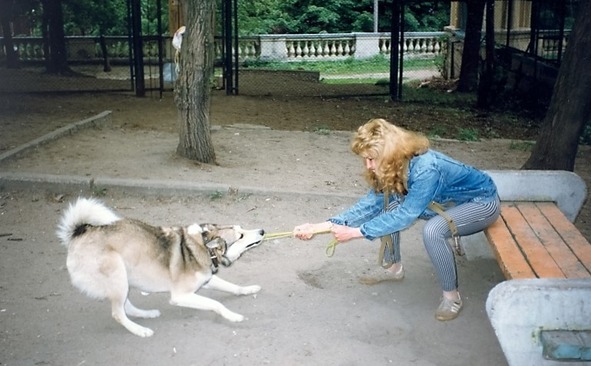 Единственным, кто нашёл быструю управу на неуправляемых цверга и лайку, была молодая Дарли. Она имела чудную привычку брать всех кобельков за гачу. Дарли ждала, когда кто-нибудь из собак начнет играть в перетяжку. Игра простая. Нужно найти большую палку и тянуть её с двух сторон на себя. Как только кто-то из собак затевал игру Дарли начинала развлекаться. Медленно, этаким мини-бронетранспортером, а ей самой было восемь месяцев, подходила к играющим, и так же медленно, со вкусом брала понравившегося ей кобелька за бубенцы. Почти тут же раздавался душераздирающий визг жертвы, и почти такой же визг хозяина жертвы. А дальше, как в немом кино, ротвейлершу отрывают от несчастного кобелька, с помощью все той же палки, с которой до этого он играл, потому, что разжать зубы противной Дарли, по-другому не удавалось. Свою хозяйку она ещё на тот момент плохо слушалась, и всякие дурацкие команды вроде «фу» или «плюнь», до неё доходили с большим трудом. С Дарли, вообще, пришлось долго заниматься. До неё всё доходило медленно, зато наука прочно застревала в её голове. После того как у Дарли отнимали трофей, мы дружно начинали откачивать хозяина жертвы, советуя, как ему лучше лечить израненную часть питомца. Дарли брала за гачу всех кобелей независимо от ранга, возраста и породы. Это не значит, что она так делала каждый раз, но никто не мог предположить заранее, когда ей взбредёт в голову «поиграть». Зато при появлении Дарли, все кобели научились почтительно сидеть, пока она обходила территорию площадки.