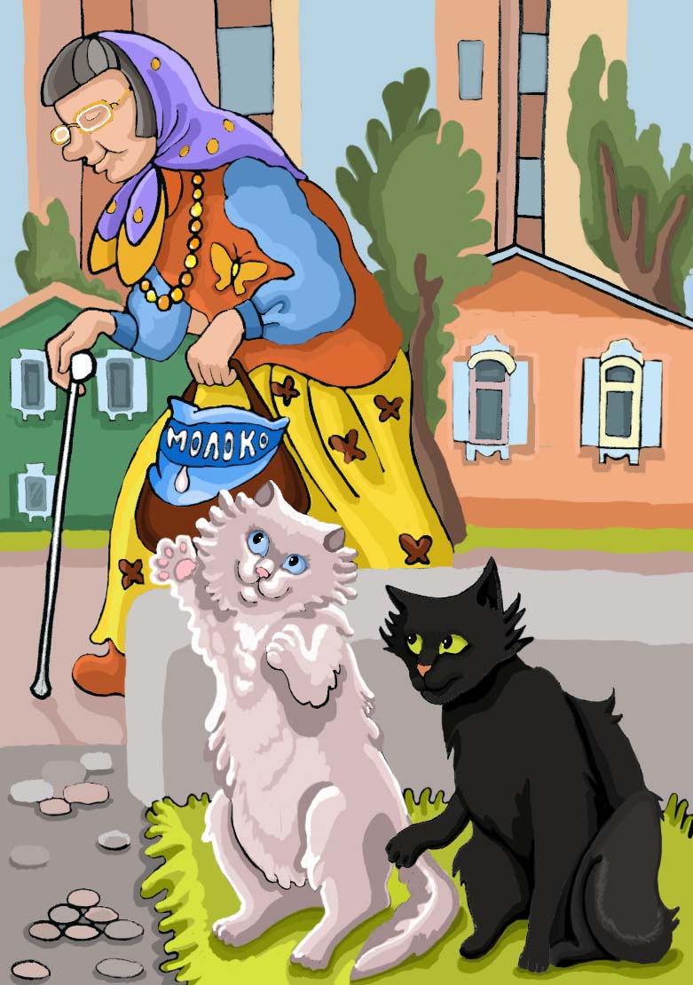 Коты заспорили. Женщина перешла дорогу и пошла дальше. Пакет уже почти наполовину выглядывал из сумки, но падать не собирался. Вдруг из-за угла выехала машина, громко сигналя. От неожиданности старушка вздрогнула и отпрянула в сторону, в этот момент пакет молока вывалился из сумки на асфальт.