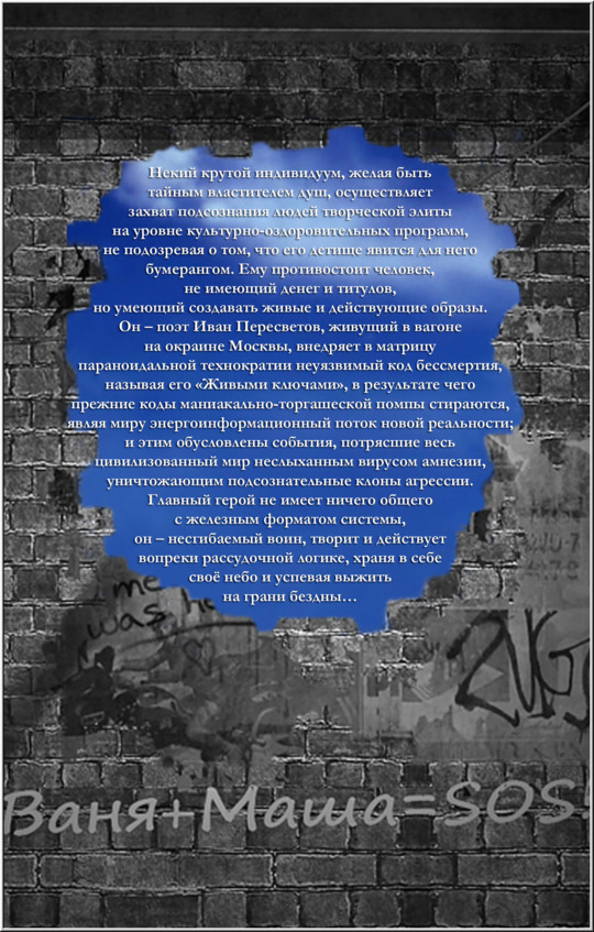 Человеческая цивилизация представляет собой синтез глобальных символов, определяя тем самым бездну познания. Достаточно посмотреть из иллюминатора авиалайнера на мегаполис, чтобы усвоить лабиринт Минотавра. А можно через знак «S.O.S!» Спасти Ось Света, постигнув тем самым бессмертие… На обшарпанной кирпичной стене одного из московских патриархальных домов среди сумбурных и неприглядных обозначений – «Вова дурак, а Петя – дебил», «Тхе Беатлез и «Дип Пуарпле», «Громи козлов!» и «Даёшь баксы!» было начертано: «Ваня + Маша = S.O.S!». Так что, не только нрав Макиавелли будоражит современного человека. Вообще, вся история нашей Цивилизации это, по сути, игра в бисер. Смотришь на кардиограмму человеческого сердца и понимаешь суть кармы; глядишь на тюльпаны и видишь застывшее пламя цветов. А вечная улыбка музыки в белых клавишах? Можно многое почерпнуть в мире образов нашей реальности. И даже в абсурде бывает пьянящая логика, – так, через «Чёрный квадрат» Малевича можно незамедлительно постигнуть идею трансформы и, минуя депрессию с идиотизмом, переплавить шок в силу, дабы начать путь Знания. В наших взглядах волнуется море прозрения. Окна мира в броне не нуждаются. Но куда ведут рельсы – эти нервы дорог? Из груди рвётся гул, – это шквал напряжения. И вот, отражение сердца – в схеме московского метрополитена. Слышите, как пульсирует кровь по артериям? Да, это чрево движения. И везде звучит музыка… А кто не помнит увлекательнейшую детскую игру в классики? Наступил на черту – вышел из игры. Стало быть, не переступай грань дозволенного и укладывайся в данную структуру, продвигайся по иерархии, но знай меру; резвись, но корректно. Но… любят, однако, переступать её, грань эту, да ещё норовят из игры не выйти. Но вот Рим всё ширил свой норов, всё углублялся в познания плоти, а потом стал плотоядным до непршибаемости и рухнул под чарами собственной массы. Но как ни крути, а всё, что ни делается – к лучшему. Разве стал бы Навуходоносор вегетарианцем, не потеряй он рассудок? Так что и в гóре есть промысел. А дух Любви всё витает над миром… Надо сказать, что город Москва является одной из ключевых сил, материализующих чаяния мятущейся души. Каковы ставки в аукционе Судьбы? Для кого – лабиринт Минотавра, для кого – фавор Провидения. Ах, Москва, патриархальнейший центр искусства и промысла, синтез души и товара, сплав идеала и моды. Дай сердцу прозрения, вдохни милости… Мы выходим за грани реального и там, – в краю фантастических грёз и живых сновидений, в мире чистой любви с её безграничной и истинной верой в безупречный путь Света, в той сокровенной, несокрушимой и всепроникающей зоне Второго внимания обретаем живую свободу для того, чтоб вернуть её миру брони и формата; и в этом скоординированном прагматизме, где всё просчитано до мелочей, где каждый имеет быт, но не всякий умеет быть, а шансы – по курсу, и даже радость имеет свойство жала, мы, одичав от шаблонно-бульварного меркантилизма с его взаимовыгодным панибратством и кухонной фанаберией, бросаем в ноги этому миру плоды познания, чтоб не погасли они в сердцах, уставших от маеты и одиночества… Вы видели, как плавятся души? Они превращаются в свет. А свет просит музыки. И она не заставляет себя ждать. Как смычок ложится на струны таинственной скрипки, на мир сошла осень. И запел он, заветрился в листопад