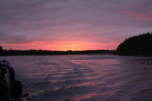 Останавливаемся на поляне высокого, по ходу левого (орографически правого) берега, покрытого огромной, в человеческий рост, но примятой лошадьми травой. Сооружением в центре поляны, назначение которого в густых сутемёнках мы не смогли издалека определить, оказывается поленница дров. Вот так делают в Бычье – заготовленные дрова колют прямо на берегу в поленья и складывают в поленницы, чтоб на лодке потом отвезти домой. 21—00. Первая ночь на воде. Потрясающий закат, невозможная тишина. Никого кругом, только поле на берегу, вытоптанное лошадьми из Бычья.