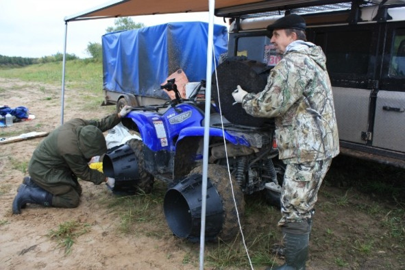«Гризлик» с прицепом. Болотные расширители колес (изобретателю – памятник). На фото их ставят на место. Интересно, поплывет ли квадрик с ними? По няше идет уверенно.