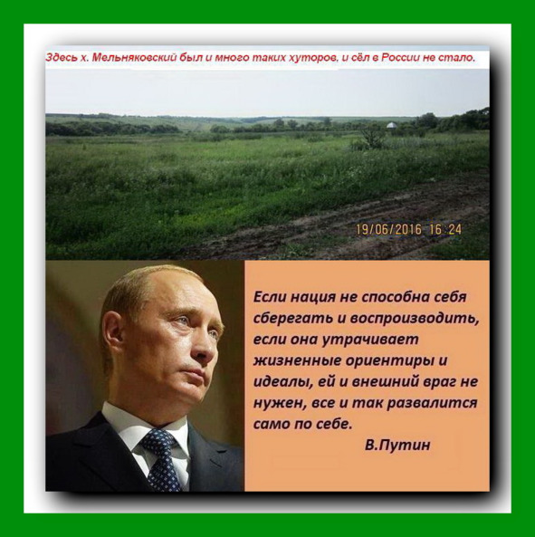 Бывалчик в 1970-тые года!Процветали донские хутора…В какой хутор не заедешь,Все работали как веер.Пахали, сеяли, убирали!Мал и стар там работали…В гос закрома зерно ссыпали,Молоко парное не попивали.Малым поросятам его выливали…Они с молока быстрей вырастали!Чтоб было мясо для страны…Мясо не завозили из Европы.Поголовья было столь тогда,Что нечем кормить было иногда…Сейчас поедешь по хуторам,Боже мой… какой развал!Кое-где, куреня ещё стоят,Пустотой на приезжих глядят…Вот здесь Мельников жил,Вот здесь Арсенов был,Вот там Михайловы жили,Вот там Пристансковы были…Теперь на кладбищах лежат,А куреня пустые их стоят.Многих и куреней уже нет!Курганы напоминают их след…С таким подходом в стране,России не быть богатой на земле.Когда патриоты, страну поднимают,А враги народа, Родину разрушают…Где же наши спецслужбы бывают?Почему врагов народа не изобличаю???Мирная политика зашла в тупик