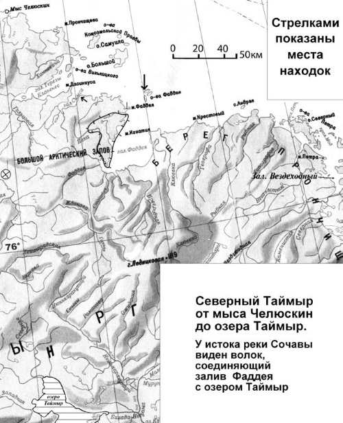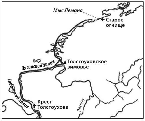 Что касается пропавших, то следует вспомнить Ивана Толстоухова. Он отплыл в 1686 году вниз по Енисею, прошел в Енисейский залив, оставил там крест с надписью и пропал без вести. В ходе ВСЭ было найдено зимовье в устье Пясины, которое назвали «зимовьем Толстоухова», а много дальше, ближе к устью Нижней Таймыры, нашли древние костры («стар ое огнище») без следов зимовки, которое тоже можно связать с Толстоуховым – см. карту на с. 32. Подробнее см. [Белов, 1969], гл. «По запретному пути».