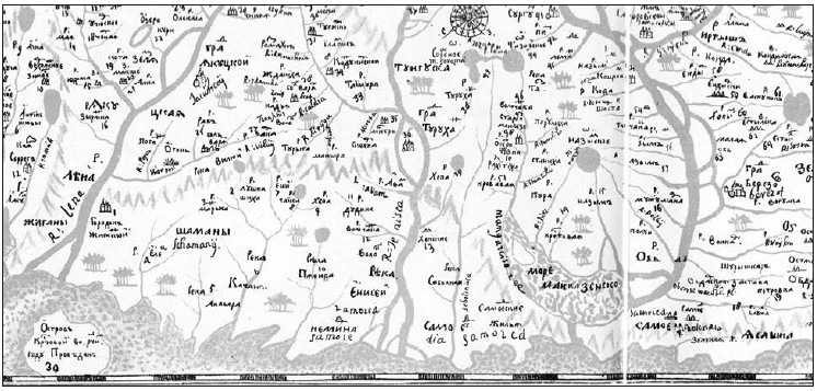 Стоит заметить, что в XVII веке расстояние по морю между устьем Хатанги и устьем Пясины вовсе не считали огромным, поскольку про огромный Таймыр не знал тогда никто – см. фрагмент составленной Семёном Ремезовым карты Сибири (карта 3). Точно так же, как никто не догадывался и о глобальном похолодании, делавшем старые сведения о проходимости Ледовитого моря ложными.