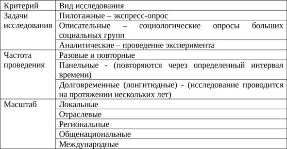 Классифицируя социологические исследования, применяют три критерия: задачи исследования, частота проведения и масштаб.