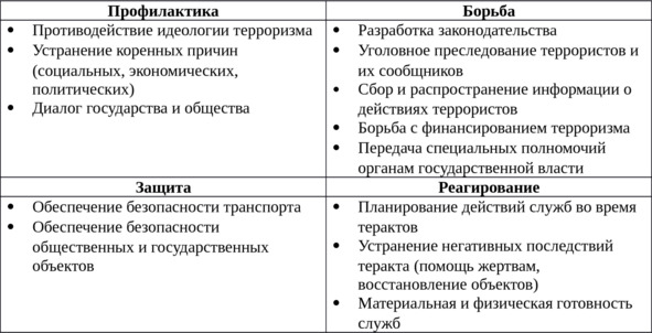 Руководствуясь подходом голландского исследователя Теуна ван Донгена, виды антитеррористической политики государства можно условно разделить на четыре основные типа, по направленности деятельности и приоритетам: 1) профилактика, направленная на предотвращение распространения террористической идеологии; 2) силовая борьба с террористами; 3) защита государственных и общественных объектов от террористической угрозы; 4) реагирование и устранение последствий террористических актов (Таблица 1) [87]. Эффективность реализации данных направлений должно получать отражение в массовом сознании российской молодежи.