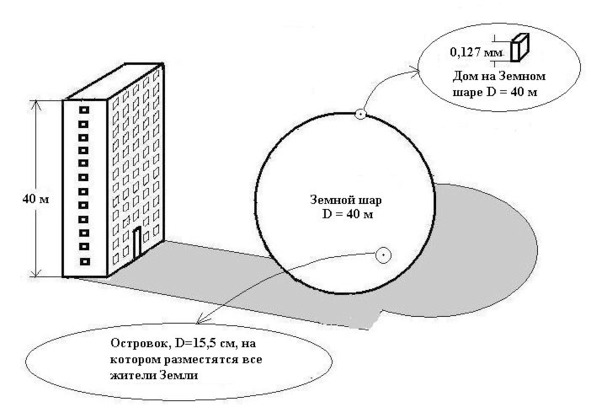 Ну, а если всё население Земли собрать вместе, – эту задачку, помнится, уже решил Антуан де Сент-Экзюпери, – собрать на островке, выделив каждому из семи с половиной миллиардов площадь по четверти квадратного метра, то каких же размеров будет сей остров на шарике диаметром в 40 метров? – Оказывается, размером он будет менее 16-и сантиметров! Его даже на картах не отметишь!