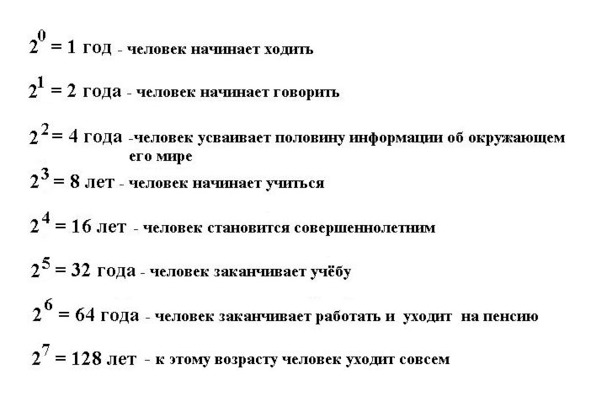 Вопрос оказался неслабый. Я так и застыл у окна в поисках ответа. А и, действительно, существует ли такой закон? – Вехи… – Первый, самостоятельно сделанный шаг… первое сказанное слово… первый школьный урок… первый день на пенсии… – И тут, вдруг! – Меня словно озарило: ну, конечно! Конечно же, это степени числа «2»!