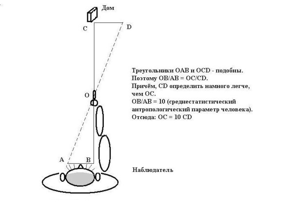 Я подошёл к окну, вытянул правую руку с оттопыренным большим пальцем и, прищурив левый глаз, совместил палец с домом. Затем, не меняя положения руки, взглянул на палец левым глазом, отметив расстояние, на которое палец «сместился» от дома вправо. Оценить это расстояние труда не составило: зная, примерно, высоту этажа, я сравнил её со «смещением» пальца: оно оказалось равным 5-и этажам, по три метра каждый, одним словом – 15 метров. Теперь осталось, – и делов-то! – умножить это значение на «10» и получить примерное расстояние до дома: 150 метров.
