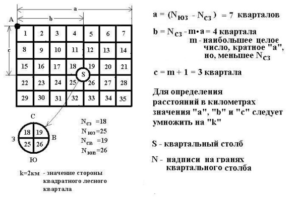 Однако, на этом «открытия» нашего лесного бродяжки не закончились. Столь счастливо разобравшись по квартальному столбу со сторонами света, он, осмелев и воспряв духом, может рискнуть определить и своё местоположение в лесу, а именнно: прикинуть протяжённость леса с запада на восток и найти (приближённо, конечно же) местоположение спасительного столбика по отношению к начальной (северо-западной) точке лесного массива. Полезно иметь в виду, что в большинстве случаев стороны лесных кварталов не превышают 2-х (и лишь иногда 4-х) километров.
