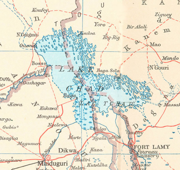 Прежде чем покинуть Чад, я попытаюсь дать общее представление об озере, основанное на наблюдениях, которые я смог сделать. Что касается размера, я определил его значительно меньшим, чем раньше предполагалось; например, северная часть, которая раньше была отмечена на картах на протяжении шестидесяти миль от устья реки Йо, мне показалась не больше тридцати, и мое путешествие по южному бассейну к устью Шари составило сорок пять миль вместо предполагаемых девяноста. Существует идея о том, что озеро высыхает (это подтверждено съемками из космоса в наше время, см. иллюстрацию) из-за потери воды, вызванной исчезновением реки Бахр-эль-Газаль, но я считаю, что размеры не очень сильно меняются, а предполагаемая ранее большая площадь во многом является результатом неточных обследований и частично тем фактом, что деревни на стороне Борну находятся в нескольких милях от озера, что создает впечатление, что они ранее были на побережье.