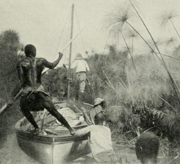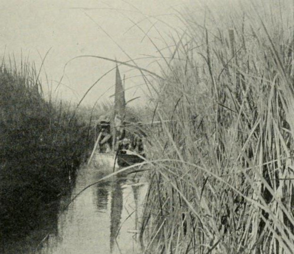 Не понадобилось много времени, чтобы пересечь бухту, а затем мы сразу начали атаку на тростники и водяные кусты, а к вечеру проложили путь почти на две мили в северо-восточном направлении. Это, в конечном итоге, привело нас в ряд крупных заливов, а глубина воды была 3 фута над бледно-серой грязью. В следующие два дня мы преодолели еще шесть миль. Это было труднее, потому что заросли здесь были намного гуще. Но эти усилия были ничем по сравнению с тем, что мы пережили, перетаскивая лодки по грязи, потому что среди камышей всегда было достаточно воды, чтобы позволить лодкам плыть, в отличие от вязкой грязи. Во время этих операций мы были вынуждены проводить ночи в лодках. О сне не могло быть и речи, потому что нас атаковали полчища москитов, и многие из туземцев предпочитали прятаться от кровососов всю ночь сидя по шею в воде. Следовательно, мы были обязаны урывать время на сон в дневное время, и поэтому каждый второй день устраивали выходной, свободный от рубки тростника.