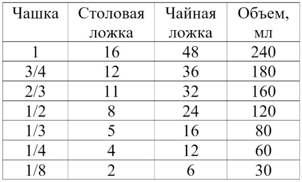 Вот соотношение чашки со столовой ложкой, чайной ложкой и объемом в миллилитрах