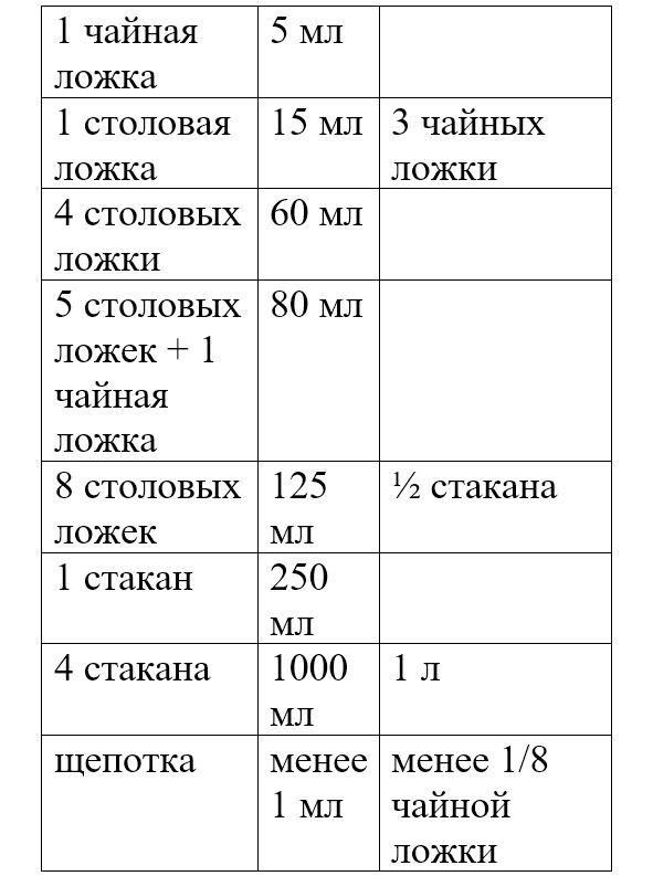 А вот соотношение объема в мл с чайной ложкой, столовой ложкой, стаканом и щепоткой