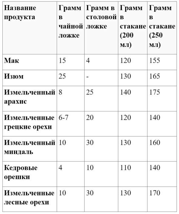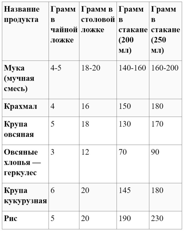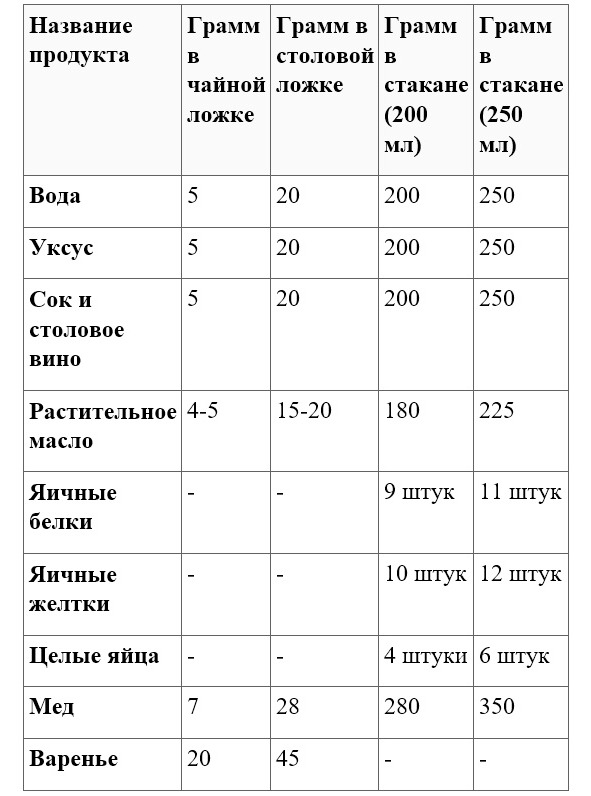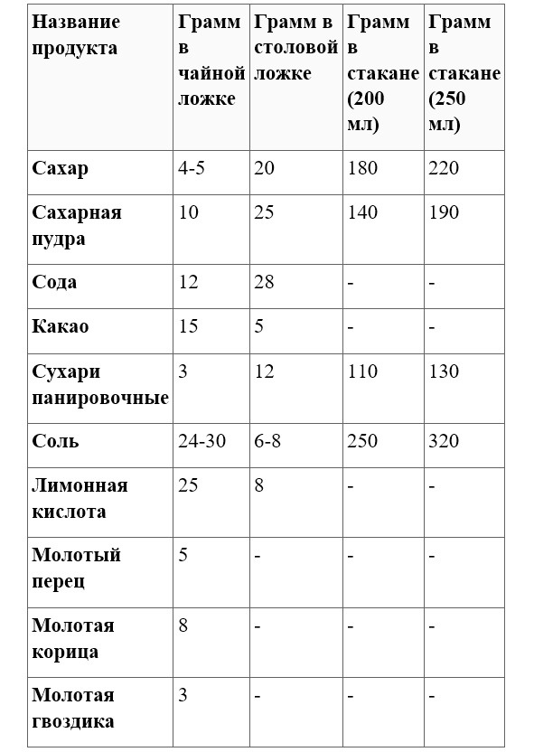 Из них вы узнаете сколько граммов продукта помещается в той или иной емкости (чайной ложке, столовой ложке или стакане).