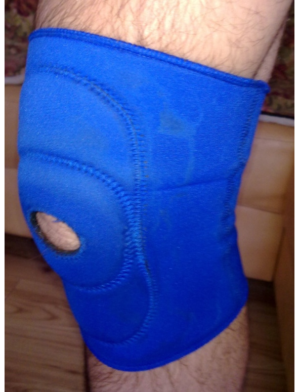 Позднее, когда вернулись в город, чтобы как-то разгрузить больной сустав, в спортивном магазине я купил себе коленный суппорт (поддерживающую повязку) из синего неопрена, что помогло, наконец, хоть как-то разгрузить связочный аппарат сустава и обезопасить свои движения. Этот наколенник неплохо прогревал сустав. С ним можно было как-то ходить и двигать ногой.