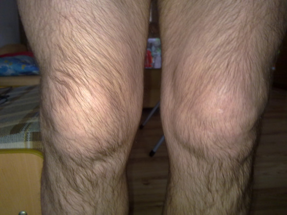 На фото тех лет вы можете видеть уже двусторонний процесс: оба коленных сустава отечны, в них увеличено количество синовиальной жидкости, которая раздувает полости коленных суставов, включая околосуставные сумки. Извините за буйную растительность на коже, но контуры отечных суставных полостей на фото видно невооруженным глазом.