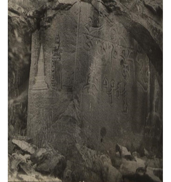 Высота надписей и изображений составляла около двух метров. Глубокая, вертикальная полоса, явно не природного происхождения, делила плиту на две части. Слева распологалось, нечто похожее на белое, круглое, островерхое здание, одновременно напоминающее буддийский Дацан, исламский минарет и индуистский храм. Островерхое изображение, без полумесяца, с двумя тёмными проёмами, напоминающими окна, тремя уступами расширялось книзу.