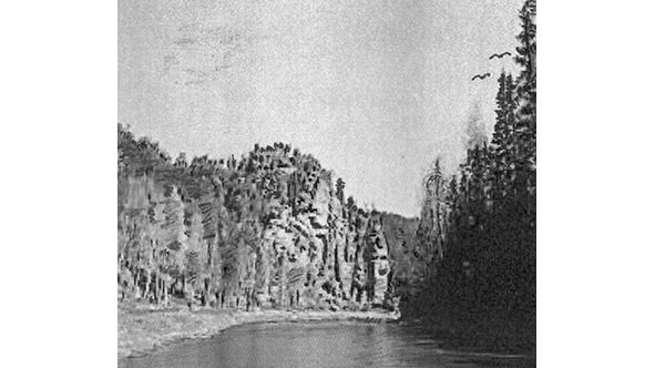 Выбравшись из землянки, скользя по мокрой траве и обходя лужи, рыбаки вскоре подошли к скале непреступной вертикальной стеной возвышающейся над речкой, окрестными сенокосными лугами и соснами. Она, как инородное тело, вырвавшееся из плена песчаных пригорков, шагнула в сторону лугов, пытаясь уйти к своим подружкам, синеющим вдали, но остановилась в замешательстве перед бурной речкой. Со стороны реки скала возвышалась, как крепость. С севера, от песчаных взгорков и соснового леса, на неё можно было без труда взойти пешком. В основании скалы, среди нагромождения камней и мелких деревьев, выделялись две, почти гладкие плиты, с рисунками и непонятными надписями.