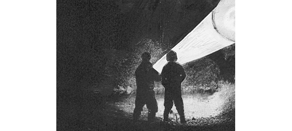 Внезапно освещаемые стены оборвались, за ними в проёме туннеля гнездилась чёрная пустота, маломощный луч фонарика ничего там не находил. Пришлось достать большой, как его называли, «караульный фонарь». Мощный, прожекторный луч преодолел тьму, и где-то в глубине неизвестного помещения, уперся в чёрную стену. Михаил, обвязавшись верёвкой, медленно двинулся по тоннелю, к порогу возникшей пустоты. Саша, пропустив верёвку за спиной, стравливал её, лёжа на ступенях, упёршись ногами в стены.