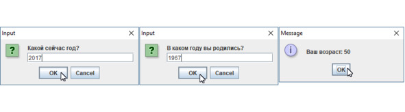 JOptionPane.showMessageDialog (null, «Ваш возраст: " + userAge);