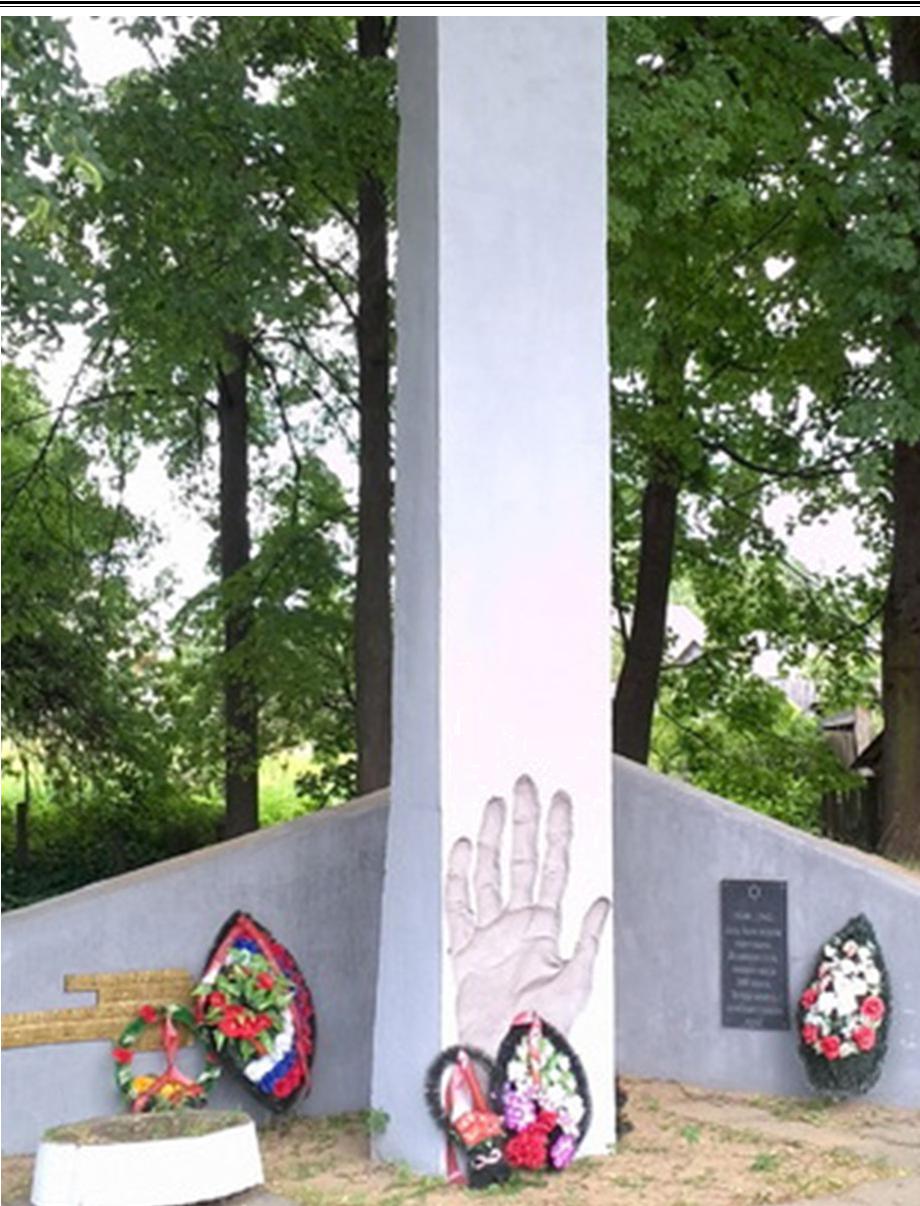Надпись справа: «28.01.1942. Здесь было зверски уничтожено Велижское гетто, сожжено около 2000 евреев. Вечная память погибшим узникам гетто!»