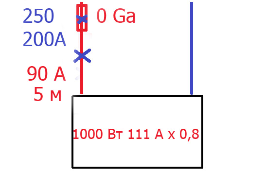Объясняю: всегда путают, как выбираются номиналы предохранителей. Такой важный момент. Допустим, у нас есть какой-то потребитель. Мощностью 1000 ватт, например. И есть провода, плюсовой и минусовой. Сечение провода выбирается с учетом нормальной работы потребителя. Каким образом мы можем посчитать, какой ток у него будет? В книжке это есть, но сделаем это еще раз. Потому что вопрос не праздный, вопрос серьезный.