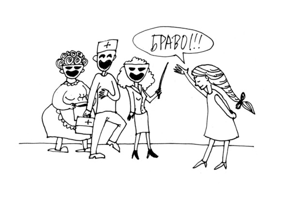 После спектакля девочка пошла домой и вдруг стала замечать, что прохожие ведут себя необычно – как будто они тоже актёры и играют небольшую роль: кто-то улыбался, но видно было, что ему не хотелось улыбаться, кто-то старался быть очень бодрым, хотя ему явно хотелось спать. Некоторые делали то, что они не хотели делать так хорошо, что девочка даже похлопала им в ладоши и крикнула «Браво!» и «Молодцы!»