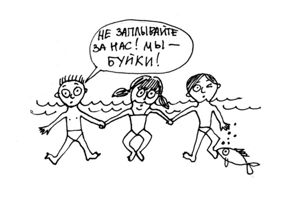 С тех пор девочка и её одноклассники работают буйками. Их вывозят в море, привязывают друг к другу верёвкой, чтобы не унесло течением, и они плавают целыми днями и кричат: «Не заплывайте за нас, мы – буйки!» Но вообще девочке это не очень нравится, потому что зимой в море холодно и как-то грустно. К тому же её за ноги иногда кусают акулы.