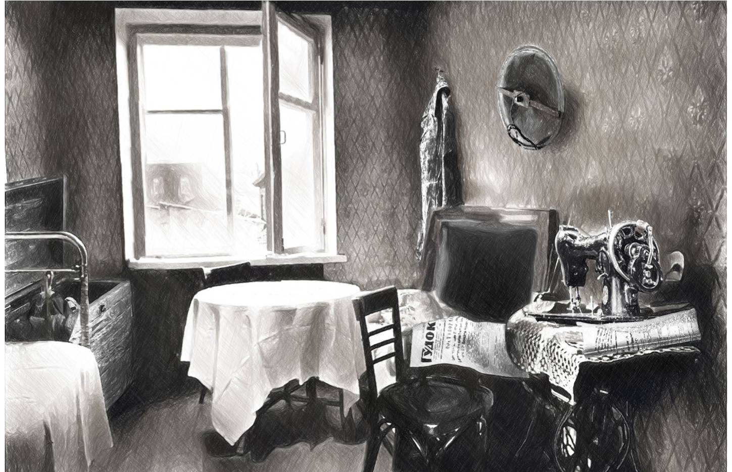Одна в большой комнате барака. Комната солнечная, светлая и чистая-чистая. Всё знакомо здесь девочке: диван, обитый чёрным дерматином, с высокой спинкой и полочкой, металлическая кровать, сундук, стол, покрытый вязанной крючком белой скатертью (мама вязала). В сундуке – тулупы, привезённые издалека, из Кустаная! В углу – тяжёлое чёрное отцовское пальто. На стене висит не менее чёрная тарелка – радио. А на полу – швейная машина «Зингер». Очень нравилось девочке перебирать шпульки и шпонки. Умными и серьёзными становились чёрные глаза, когда девочка взбиралась на диван и с благоговейным трепетом прикасалась к страницам подшивки газет «Гудок». Тут же лежала тетрадь со схемами или чертежами. Непонятные линии, но чёткие, строгие, элегантные. Загадочно и возвышенно Длинные пальцы худенькой смуглой руки не уставали час за часом день за днём перелистывать страницы с зашифрованными рисунками: рычаги, колёса, паровоз.