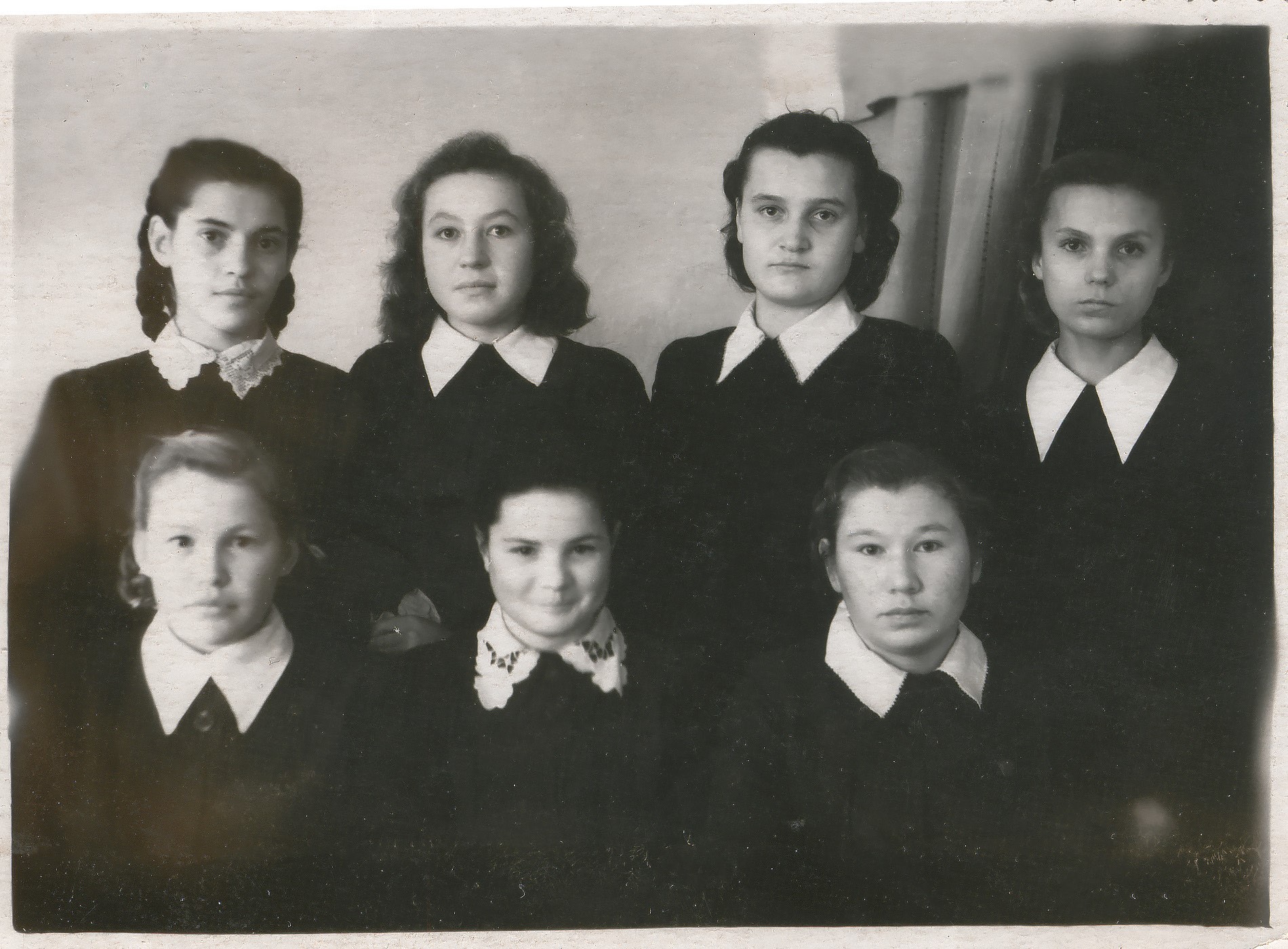 1952г, Педучилище, наша комната 2й курс, Тома Аксёнова, Валя Цыганова, Люба Дубец, Вера Шутегова, Лена Балбашова, Маша Акишева