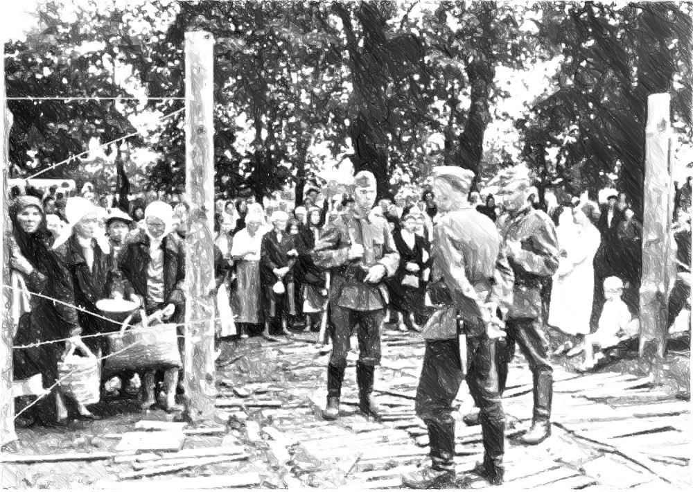 В один из осенних дней Устинья и жена друга Петра пришли в Бобруйск, нашли не тюрьму, а лагерь пленных. Намцы не желали слушать местных крестьянок. Женщины вернулись в Куритичи не солоно хлебавши. Что случилось с Петром и другими пленными остаётся только догадываться. Их или расстреляли, или заморили голодом и нечеловеческими условиями. Пётр погиб. Устинья осталась одна без мужчины-работника, без мужа – опоры, без хозяина. Первые два года войны немцы сильно не свирепствовали. У них были другие цели: Москва, юг России. Но власть на оккупированной территории укрепляли, для порядка, вербовали в полицаи. Несколько односельчан Никиты с готовностью переоделись в полицаев. И Никите предлагали пойти на службу к немцам по причине ненависти к большевистской власти, колхозам и откровенным грабежам; радовались: мол, наступило наше время. Никита ответил одному из них по имени Михаил: «Ходил ты в лаптях, в лаптях и останешься». Никита не понаслышке знал немецкий характер, их «щедрость» и жестокость. Но мальчишкам было не усидеть в хате. Бегали везде, где хотели. Зимой, в начале 1942 года, понесло ватагу мальчишек к хоздвору немцев, к отхожей или отбросовой яме, к которую немцы сливали отходы от кухни, бойни коров, свиней. Голодные наивные «хлопчики» думали разжиться свиной ногой. Но немецкие овчарки не потерпели конкурентов, бросились на мальчишек. Миша, как и все побежал, но упал. Собаки, науськиваемые немцами, рвали одежонку хлопчика, пытались прокусить старый кожушок.