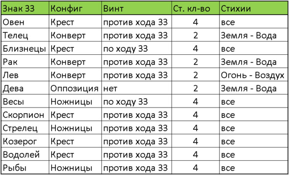 Три первых примера выявляют некоторые повторения, а именно: задействованы все Стихии, как следствие – конфигурация Крест. Но вот незадача, винт развёртки начал закручиваться по ходу движения Зодиака.