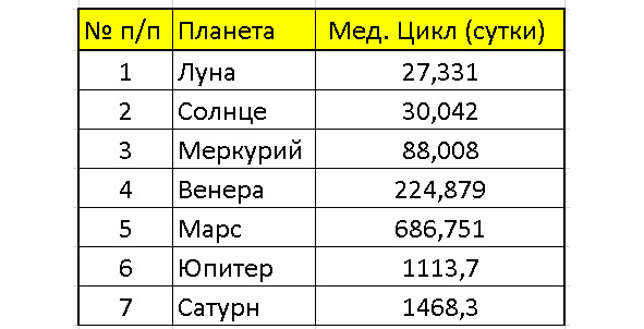 Ответ на первый вопрос чётко определяется величиной медицинских циклов планет (см. таблицу).