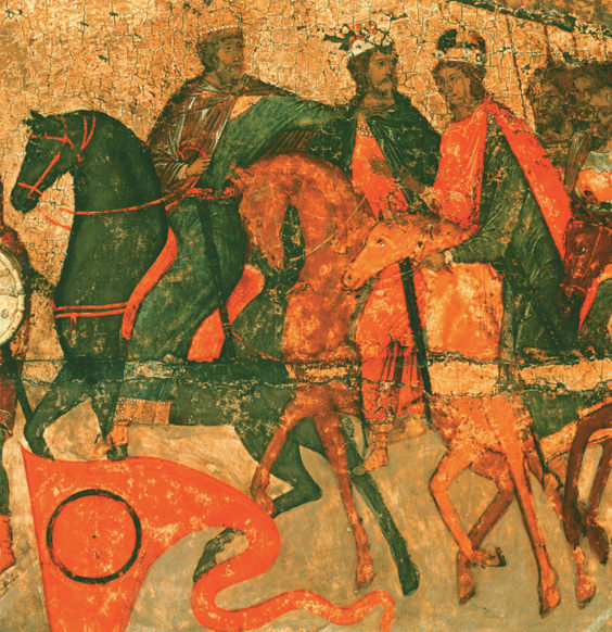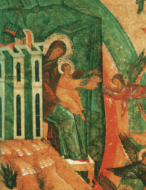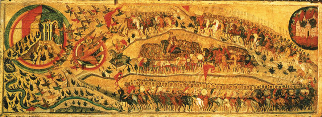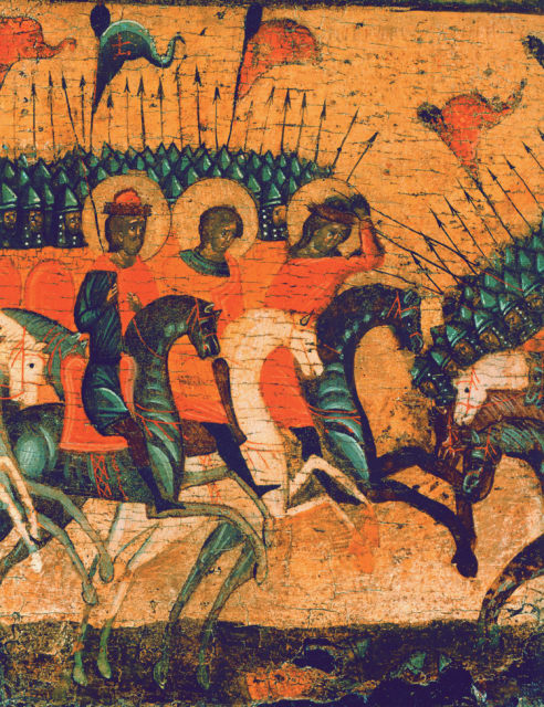 Внизу мы видим итог чуда, явленного Небесной заступницей. Из ворот новгородского кремля выезжает рать во главе со святыми заступниками Георгием, Борисом и Глебом. Схлестнулись копьями два войска, но справа конница побежденных суздальцев уже обернулась вспять и покидает поле боя.