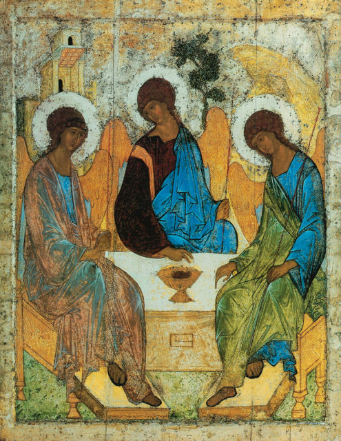 «Троица» – единственное бесспорное произведение Рублева. В Ветхом Завете повествуется о том, как старцу Аврааму и его жене Сарре явился Бог в виде трех мужей-ангелов. Авраам и Сарра приготовили для них трапезу, затем один из ангелов предсказал пожилым супругам рождение долгожданного наследника, сына Исаака, который станет родоначальником «великого и сильного» народа.